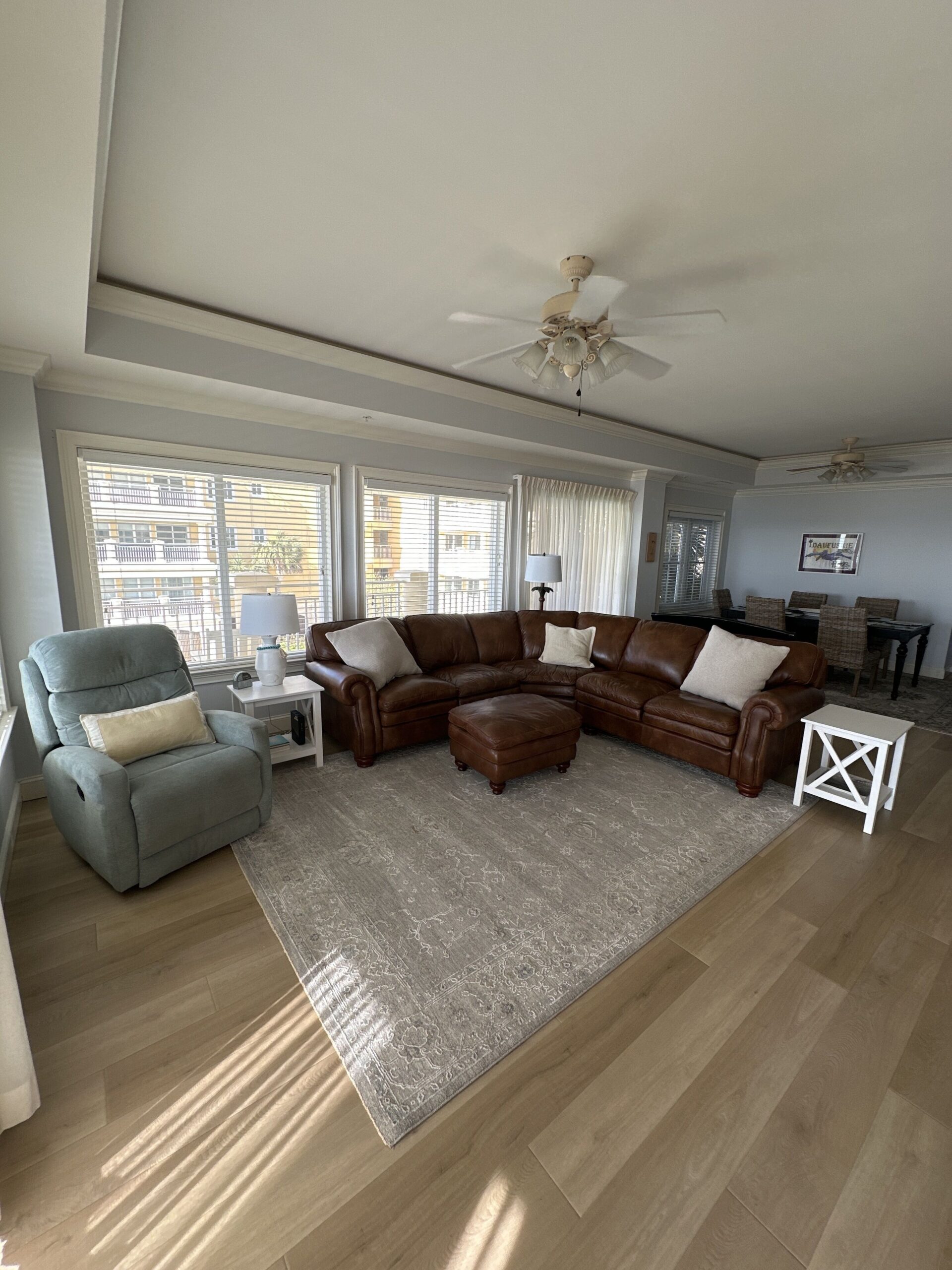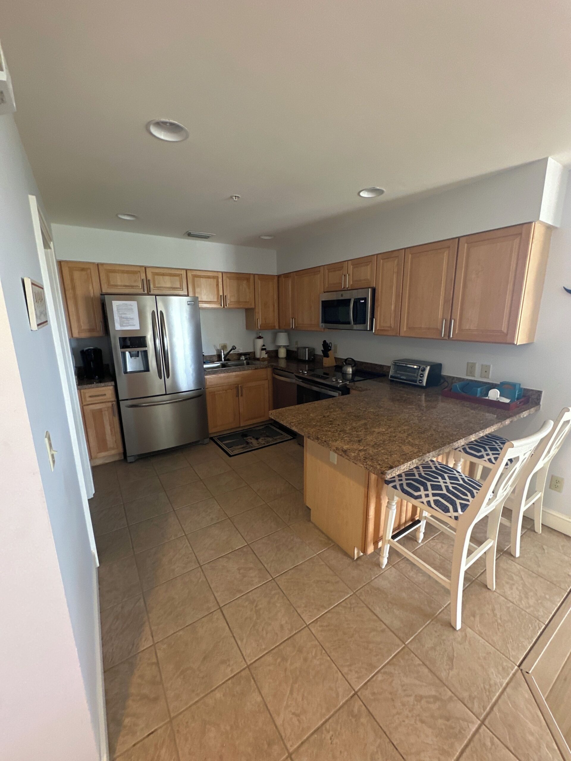 Newly decorated and beautifully furnished. The Condo comes with a fully equipped kitchen with a laundry room off the kitchen. The Condo has 3 bedrooms and sleeps 6. Master Suite has a king bed with sliding glass door to the wrap around balcony. Second Bedroom has a Queen bed and the third has a Queen bed. All bedrooms have their own private baths. Condo has open concept for living room/eating area that oversees the ocean. Living room has a L-shape sofa bed. The dining area seats 6. The fully equipped Kitchen includes a granite breakfast bar which seats 2 and top of the line appliances. Laundry room with full size washer and dryer is located off the kitchen. Gas Grills are located in the poolside area .