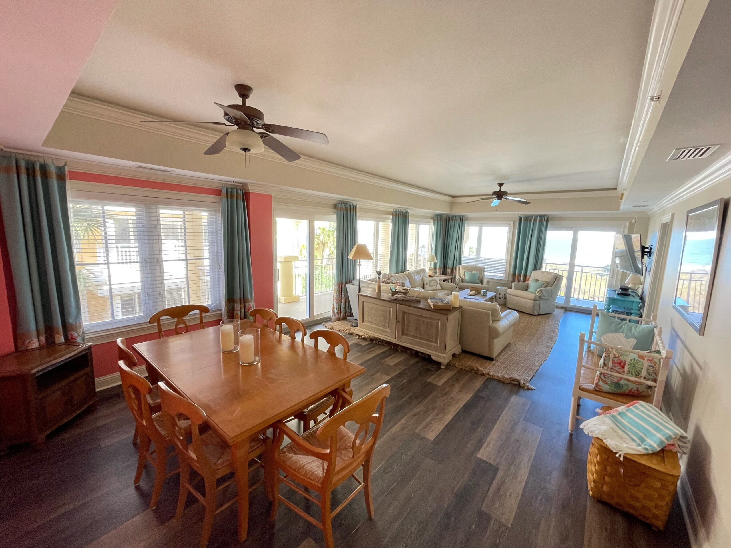 This luxury condo is perfect for a family of 6 with hardwood floors throughout the condo. The master bedroom (w/king bed) opens up to the balcony. The second master bedroom also has a king bed while the third bedroom has twin bunks. All bedrooms have their own private baths. The kitchen is fully stocked with everything you need to cook any meal; including coffee maker, toaster, pot/pans, cookie sheets, knife set, electric wine opener, coffee mugs, etc. The condo has a full washing machine and dryer and we supply you with laundry pods.